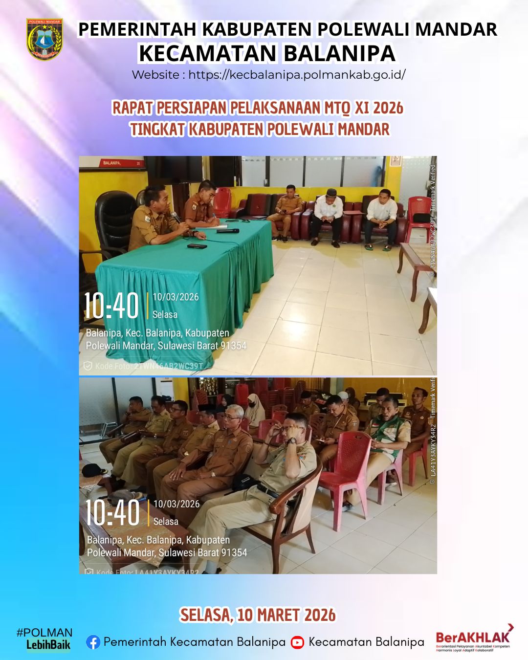 Balanipa, Selasa 10 Maret 2026. Pemerintah Kecamatan Balanipa sedang Melaksanakan Kegiatan Rapat Persiapan Pelaksanaan MTQ XI 2026 Tingkat Kabupaten Polewali Mandar di Aula Kantor Camat Balanipa pada hari ini Selasa 10 Maret 2026, Pukul 10.00 Wita Sampai Selesai. Kegiatan ini di Pimpin Oleh Camat Balanipa (Abdul Malik, SH. MH) sebagai Pembuka dan di lanjutkan oleh Sekretaris Camat Balanipa (Indar Jaya) . Rapat ini di hadiri Kepala KUA Tinambung, Ka. PKM Pambusuang, Kepala Sekolah Tingkat SMP/MIS, SMA/MA Sederajat, Lurah Dan Kepala Desa Sekecamatan Balanipa beserta stalholder lainnya. ...